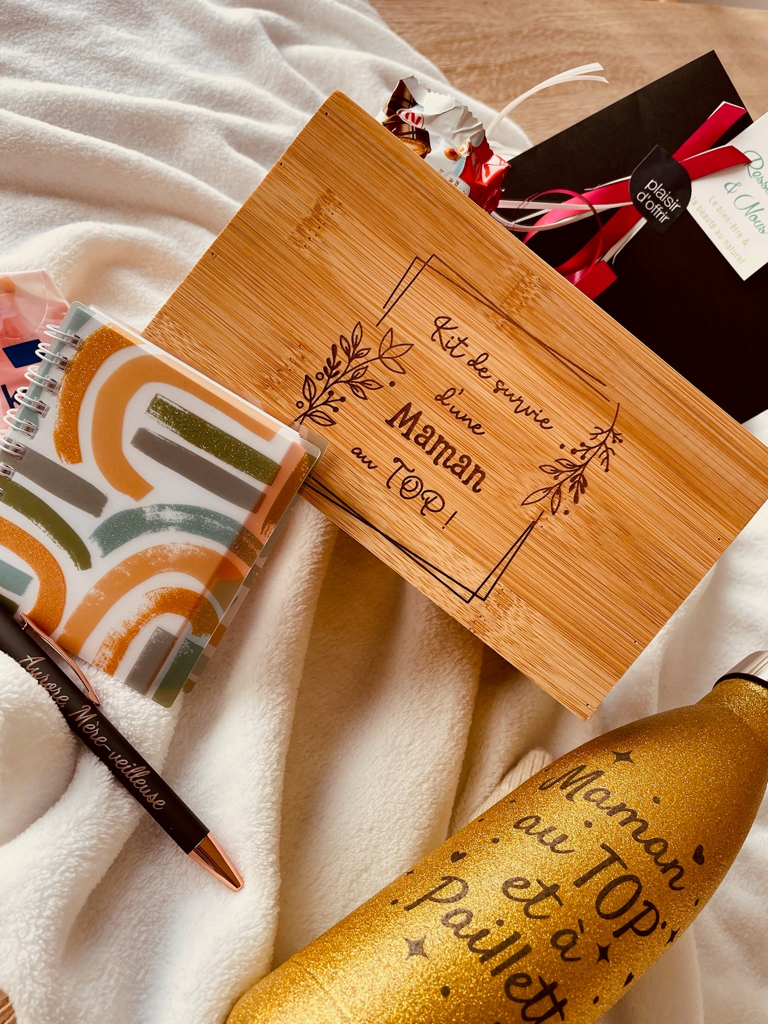 Kit de survie pour jeune maman. Comprend 1 gourde haute en couleur, une boîte pratique, un bic personnalisé et des post-it pour libérer la charge mentale. Peut être accompagné d'un bon pour un soin bien-être (50€)