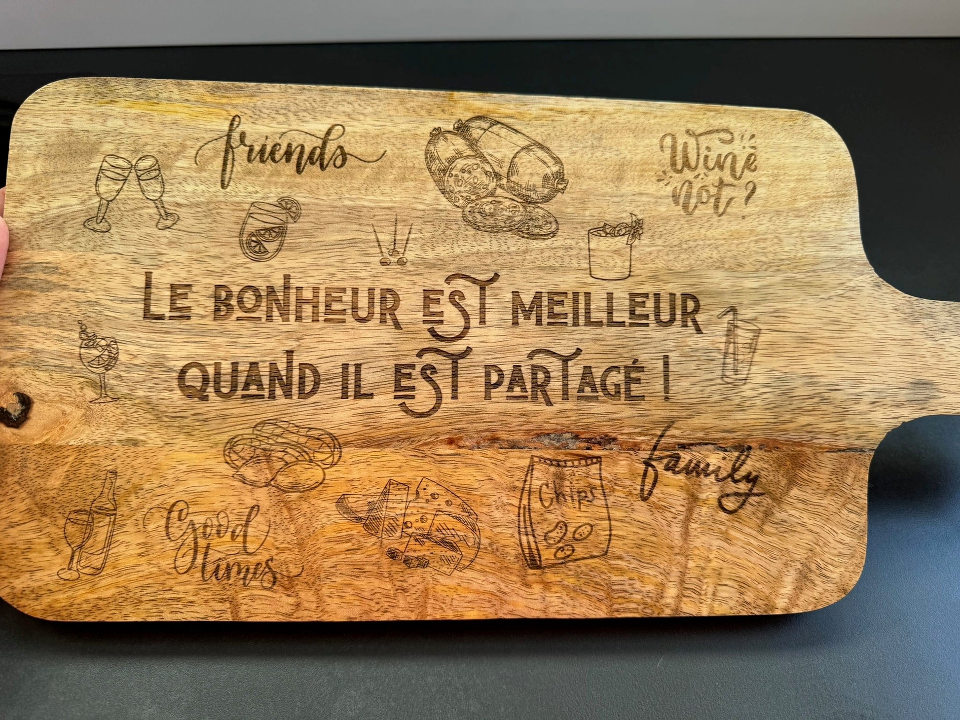 Dimension totale : 45cm x 20cm. La disposition peut changer en fonction de la planche. Le bois est un matériau naturel, le résultat peut donc varier d'une planche à l'autre.